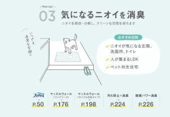 日常生活の中で気になる調理中やペットなどの臭いに対して、「ファブリーズ」機能付きクロスは、臭いの元を効果的に中和し、空間をより快適に保つ役割を果たしてくれます。クロス自体が消臭機能を持っているため、持続的に効果を発揮してくれます。さらに日々のストレスを軽減し、快適な住環境を提供してくれます。